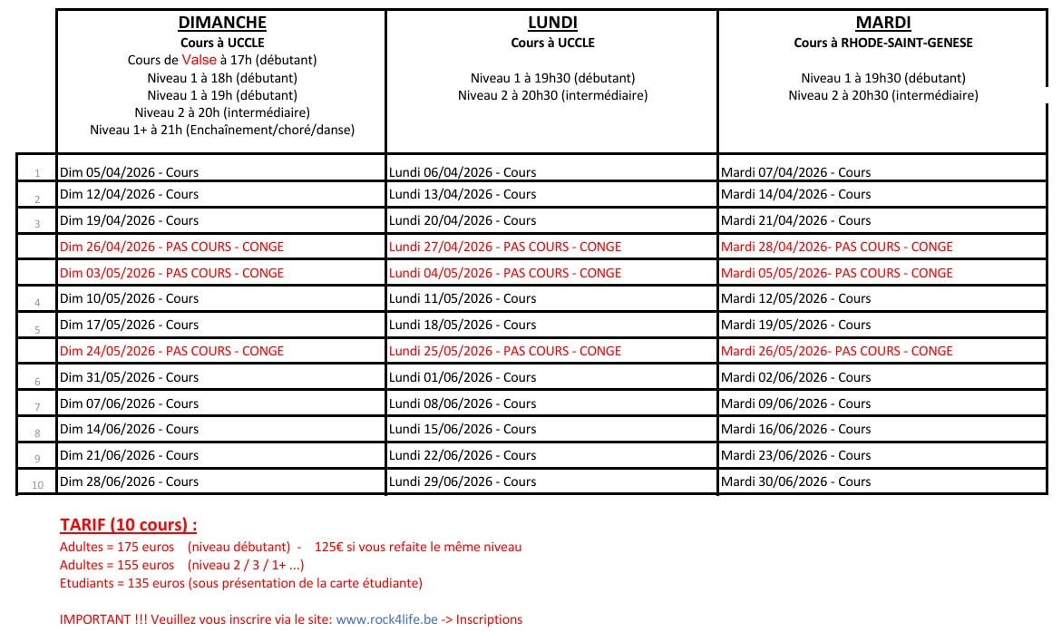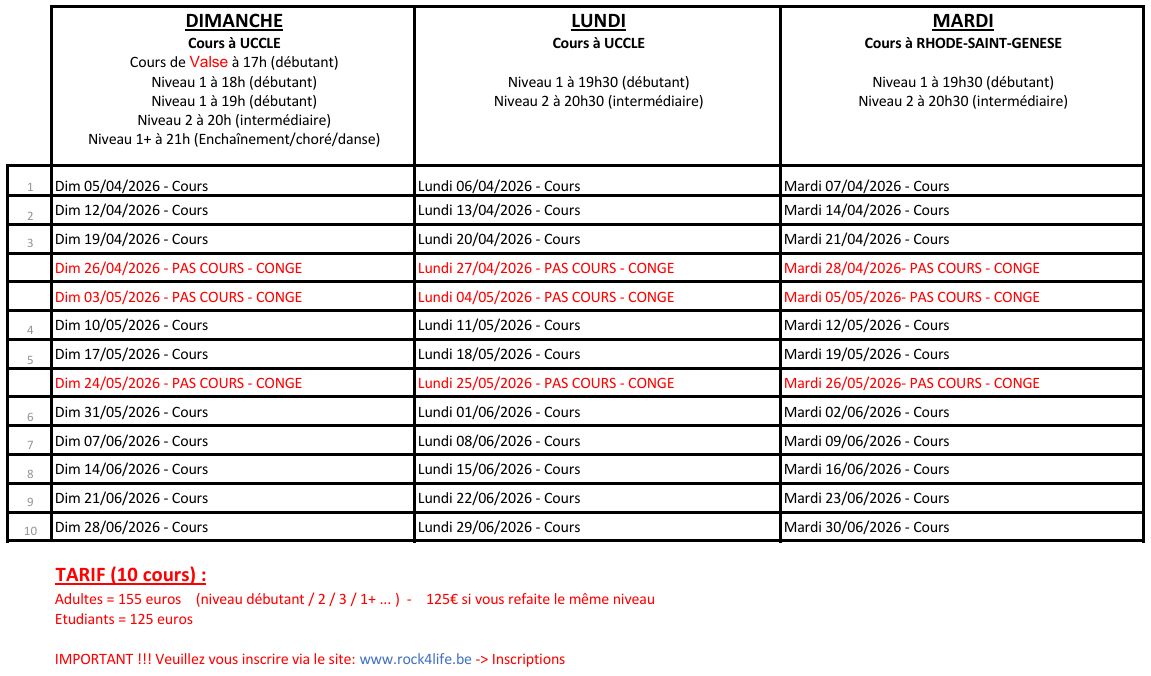 Les cours de rock et de valse se donnent à Bruxelles (Uccle) -> les Dimanches et Lundis